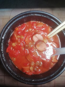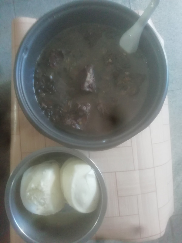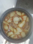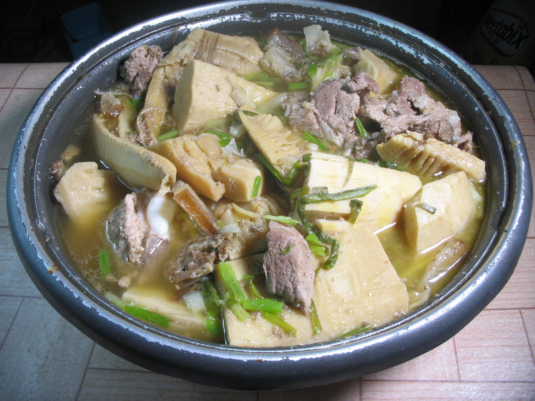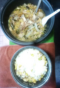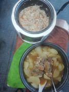 把昨天吃剩的菌菇炖猪脊骨加白萝卜一起炖。十分鲜甜可口,去秋燥。这道菜是“大众菜”的典型。猪脊骨和白萝卜都属于“最贱价”。它是“人民公社大食堂”专用菜,无产阶级最基本的“吃点儿”保障。