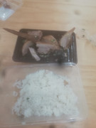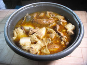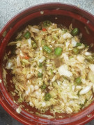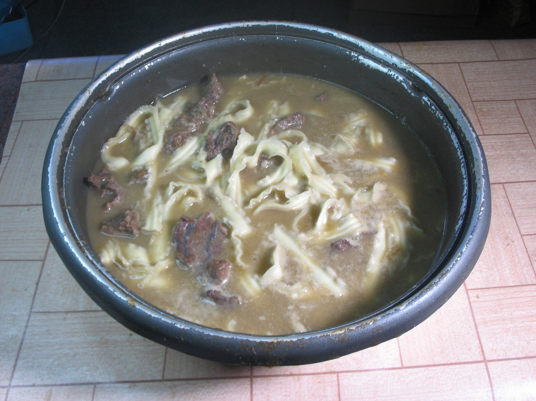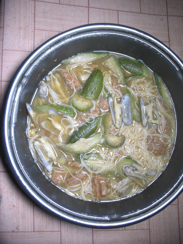 瘦肉、蛏子、丝瓜与糊头米粉一起煮的米粉汤。以前惠安农民都这样吃,那蛏子都是干原蛏(没有浸过水的)。干原蛏煮汤味道鲜掉眉毛了。黄蛏是闽省沿海特产,产量极大。每到夏季,福州人餐桌上都有“老酒炖蛏”这道菜,而现在一般人吃不起这道菜。那并排的一斤半干原黄蛏可能要几十元成本。