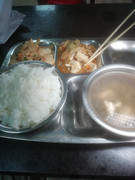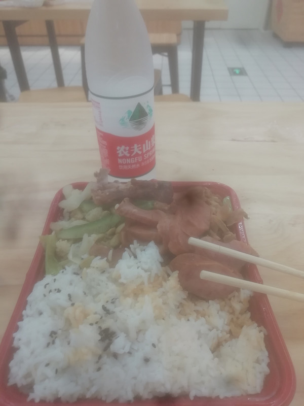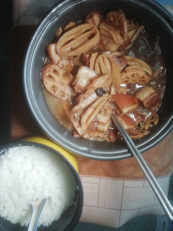 午餐干饭配红烧肉加莲藕。