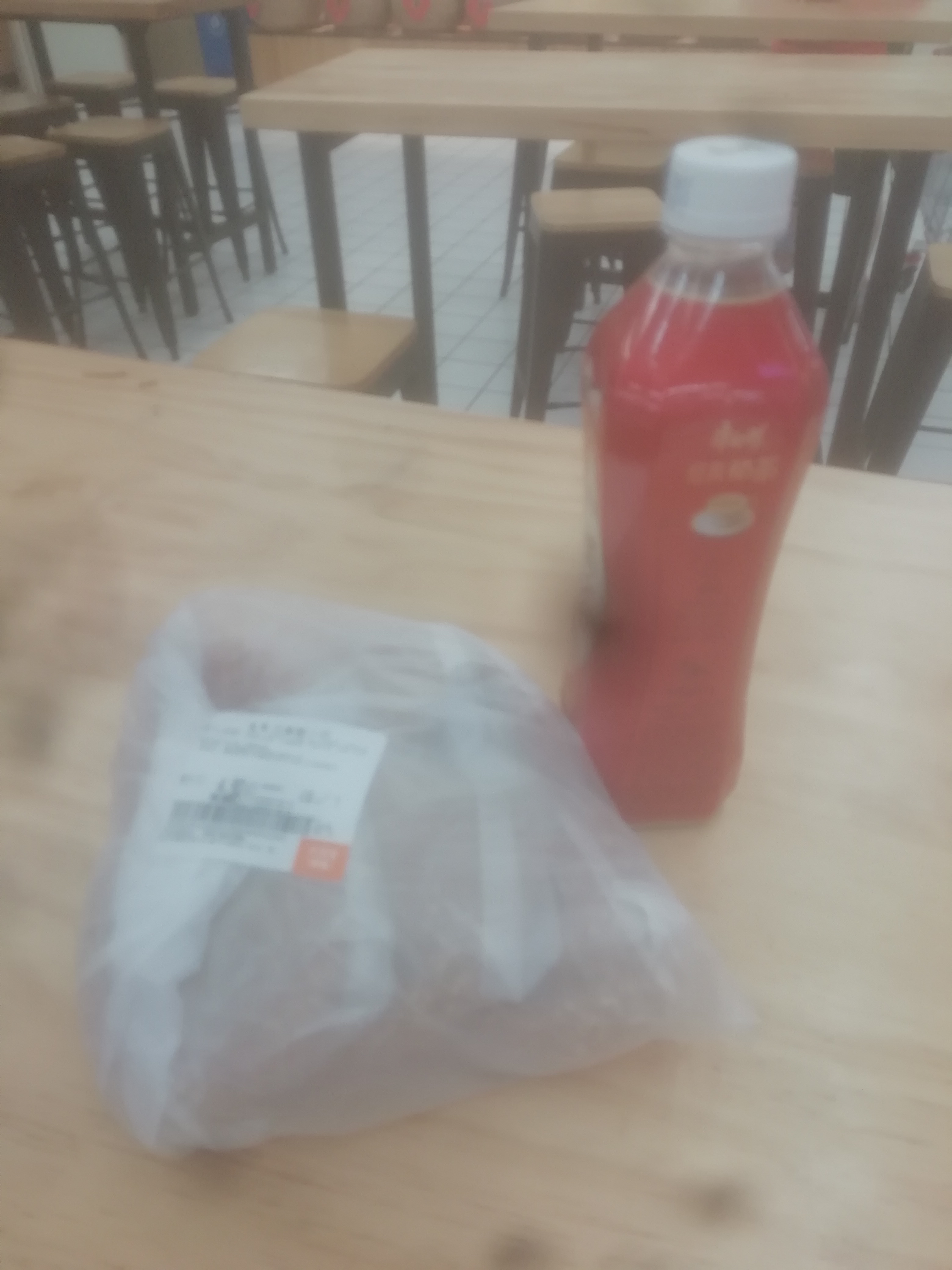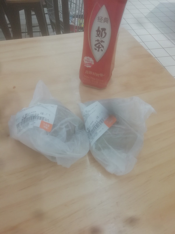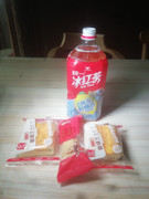 “大润发”晚上7:45开始有“糕点3合l¥4.90特价”,这包里面6个麻球。我又买了一瓶“康师傅”奶茶。