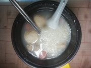 把黑豆、猪脊骨、海蚌、汤料包加在一起炖汤。