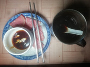 “水煮三文鱼”上面一层是三文鱼片,下面垫的有牛肉丸、鱼丸、海带结、土豆片、黄瓜……这都是超市卖剩的一起用“水煮”的方法烹饪而成,味道相当好!