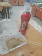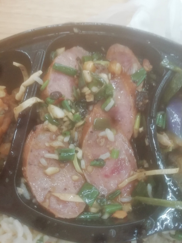 这腊肠可能是昨天卖剩下的,没有什么味道了。我走到烧腊柜台拿了一盒“葱姜汁”浇上。