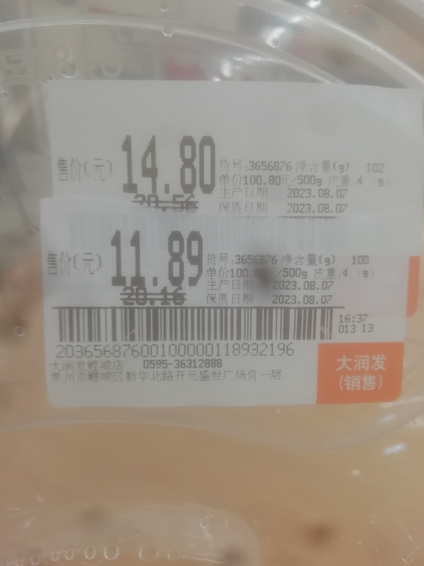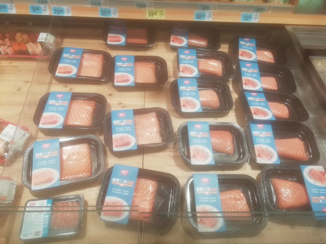 最近数天去大润发,也可以看到有卖一款“水煮三文鱼”。一份¥10.00。