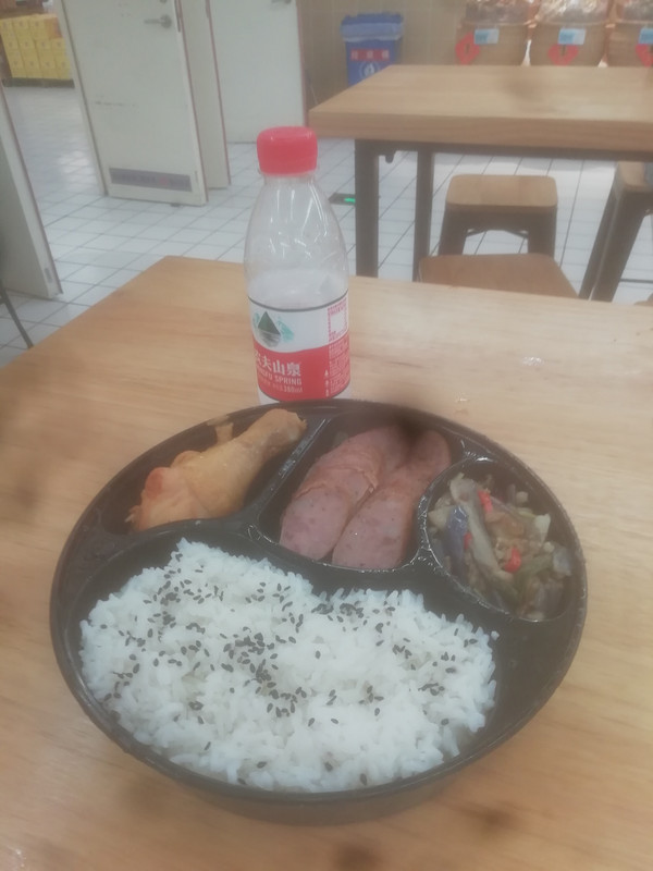 原价¥15,今天打折到¥12。超市的便档怎么能卖这样便宜呢?那是因为超市可以把几天以内没卖完食物做成便档菜出售。这一份有米饭、有腊肠、有茄子和空心菜,又好吃又吃得很饱。
