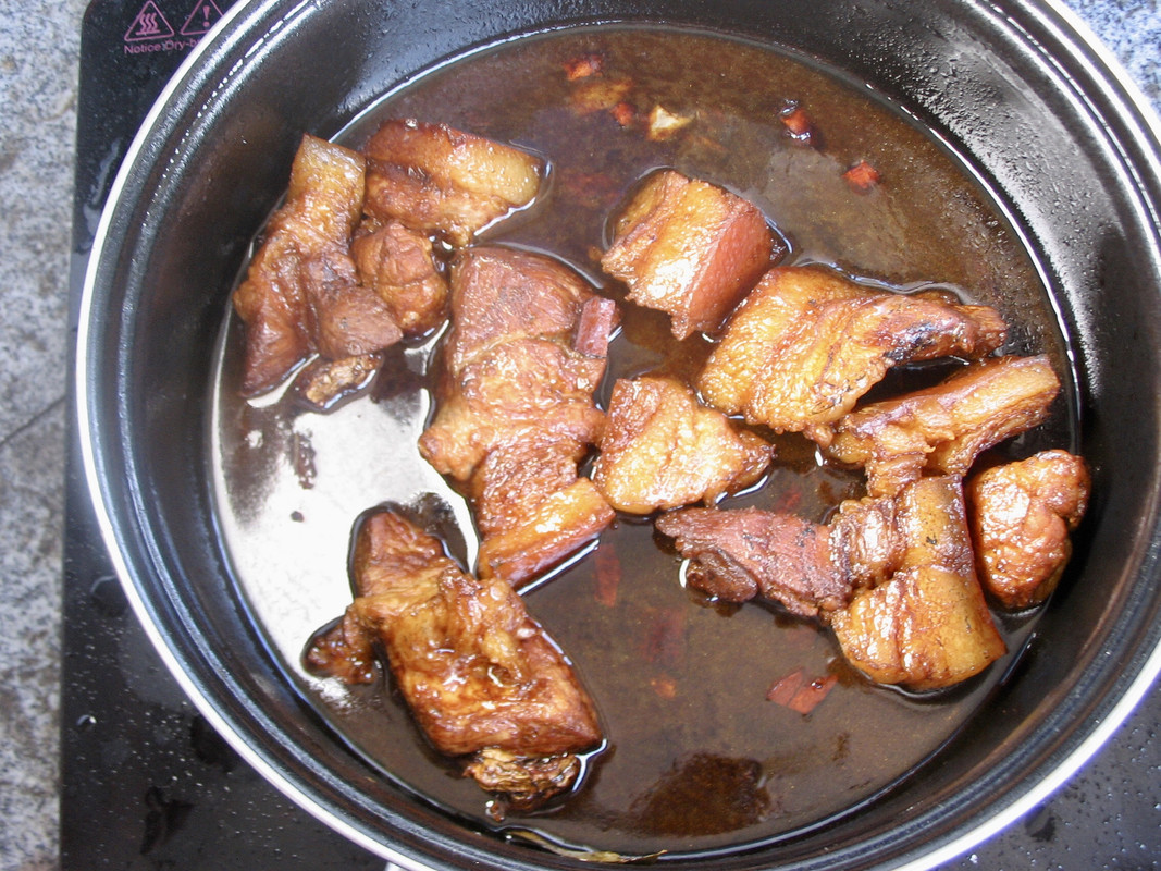 用猪后腿肉煮的红烧肉。