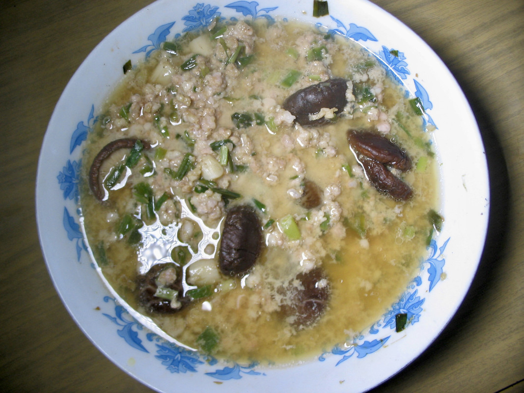 酱油水炖肉糜。本来酱油要放很多,现在不想吃那么咸口。把五花肉碎和蛋以及韮菜或葱珠捣在一起隔水蒸熟。