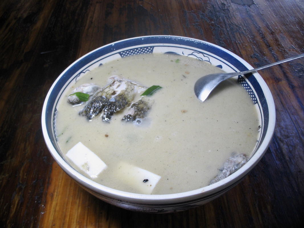 在家里烧鱼汤就是这么简单,这种过于”大众化”的菜肴基本上不用去馆店吃。由于我昨天烧的鱼汤把豆腐弄得很碎不好看,所以中午去“江西饭店”点了这份“卿鱼豆腐汤”。豆腐鱼汤煮起来样子都差不多。用“内脂豆腐”煮鱼汤比用“盐卤豆腐”煮更好。