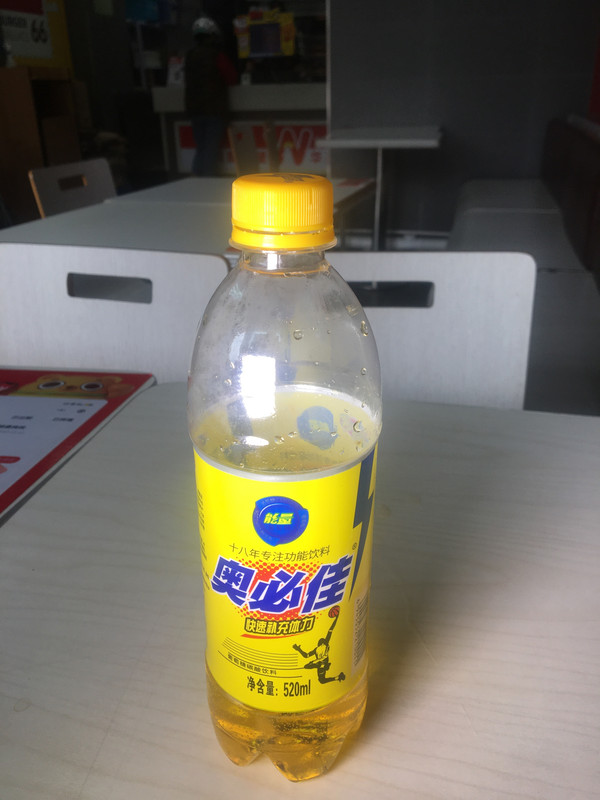 喝一瓶营养饮料。这个饮料就是简单到加个葡萄糖这么简单,然而非常有效果。它的原理就跟医院里用葡萄糖水打点滴的原理相似,体力下降喝葡萄糖水可以恢复。这是早年第一代的营养饮料,后来才有了红牛饮料,现在又有了电解质饮料。电解质饮料的原理更科学,效果也更好。电解质饮料的原理就不是经验性的了,而是纯科学的了——把水电解成几个分段。